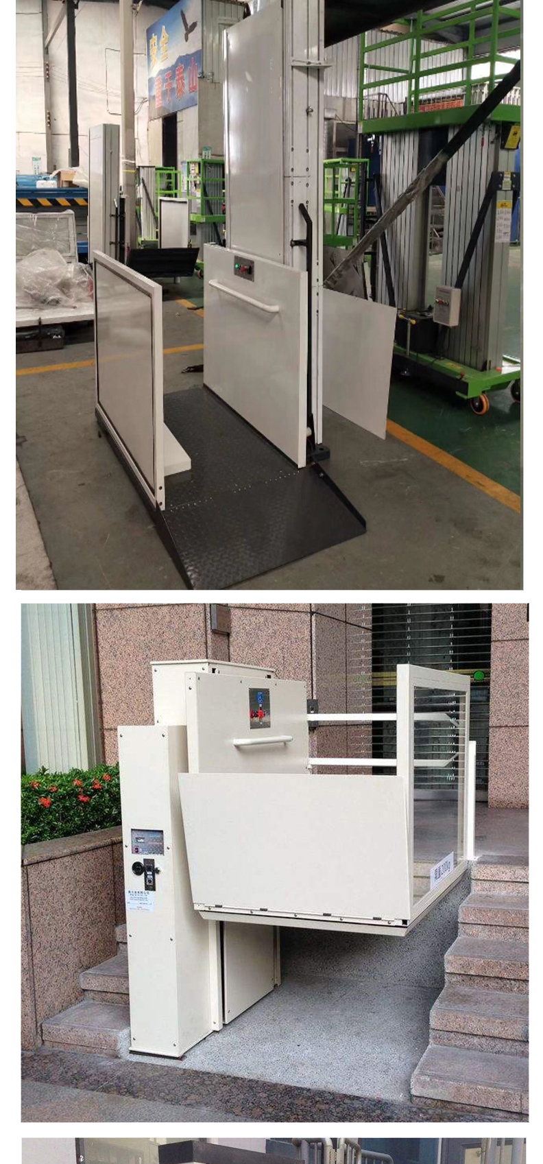 無障礙升降機:是為殘疾人專門設計制造的升降機。為方便殘疾人出行及觀光,在社區,醫院,學校,賓館,酒店,公共場所等地方。旅游觀光梯通道的自動扶梯旁,安裝了無障礙升降機。無障礙升降機可容納輪椅車出入,殘疾人或行動不便者只需按一下兩端的求助按鈕,值班人員就會立刻開啟自動升降機.